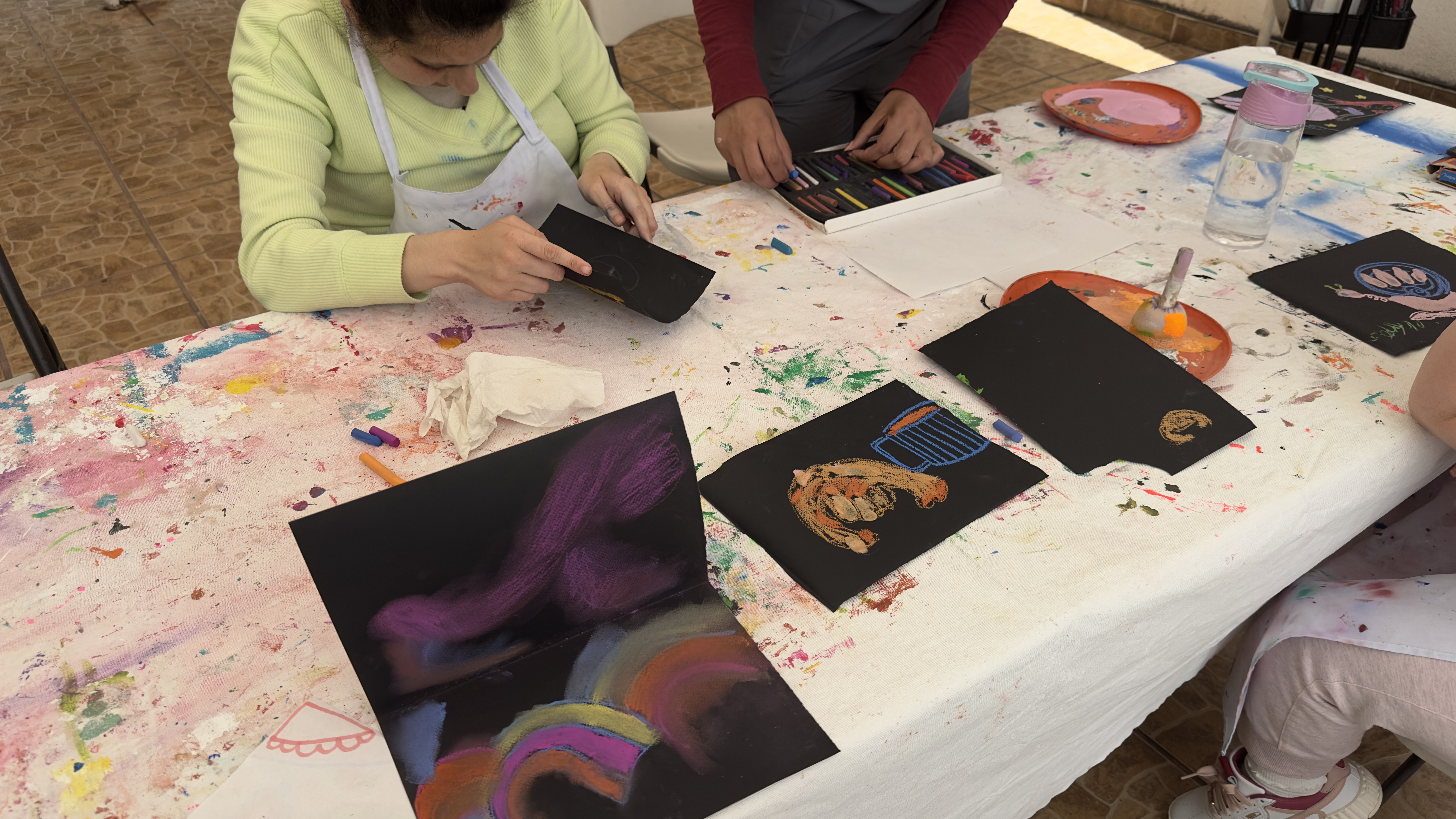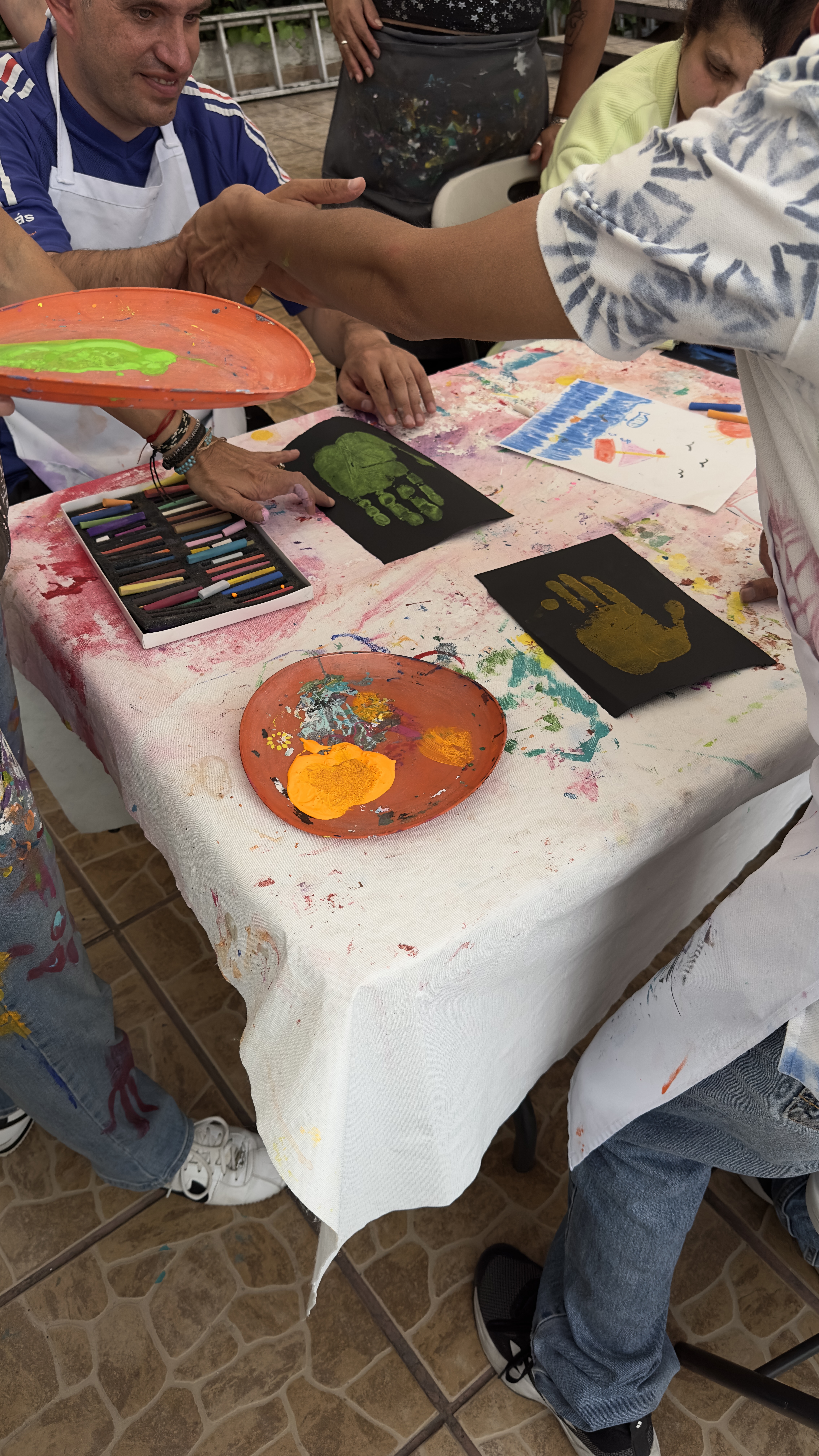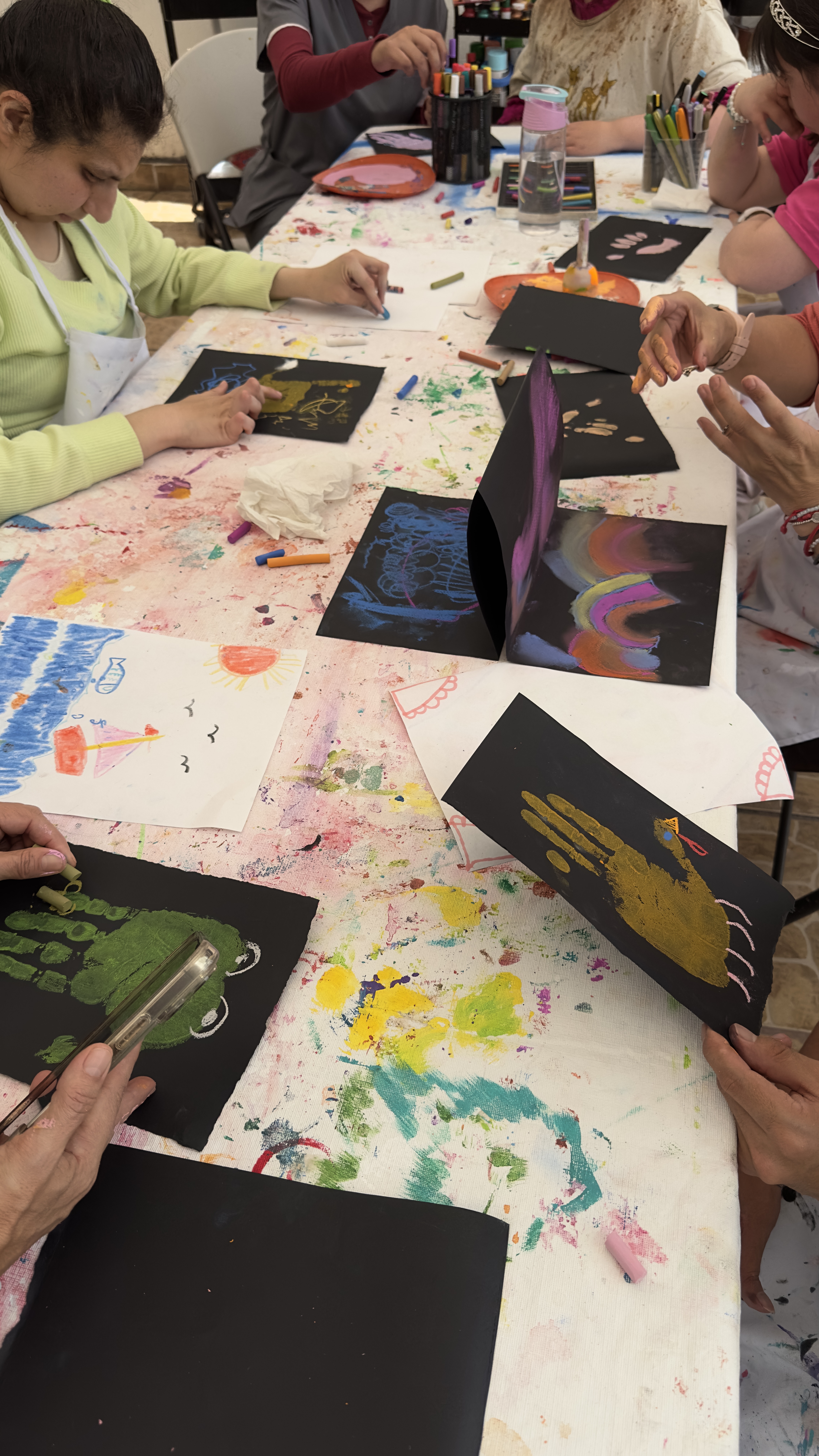 Finalmente, en hojas individuales, cada participante imprimió su mano con pintura acrílica y dibujó basándose en esa forma. Fue interesante notar que no todos los participantes imprimeron su mano de la misma manera - algunos en forma de puño y una participante, en sus palabras, “en forma de cuernito”.