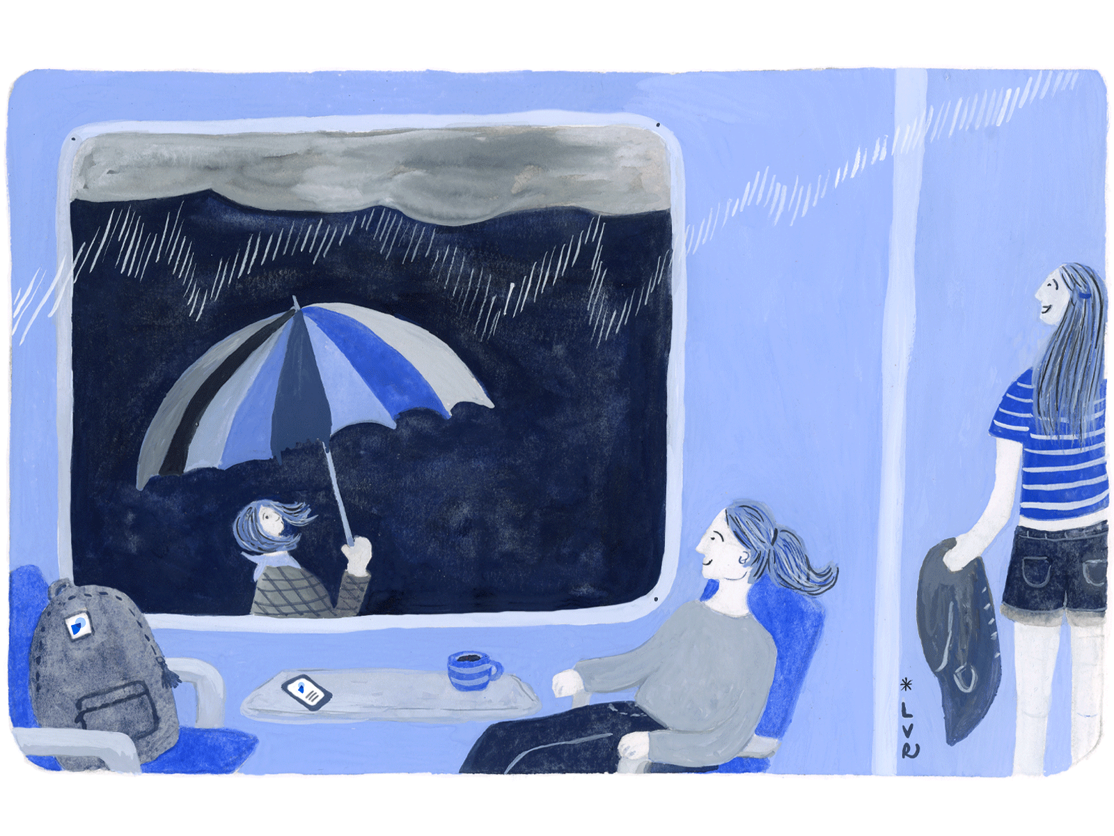 Las ilustraciones son gouache sobre papel en una paleta monocromática con el azul del logotipo, y cambios en valor y saturación.